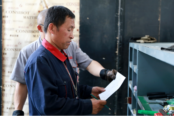 冯国成和同事研究组装车间顶升设备技术革新
